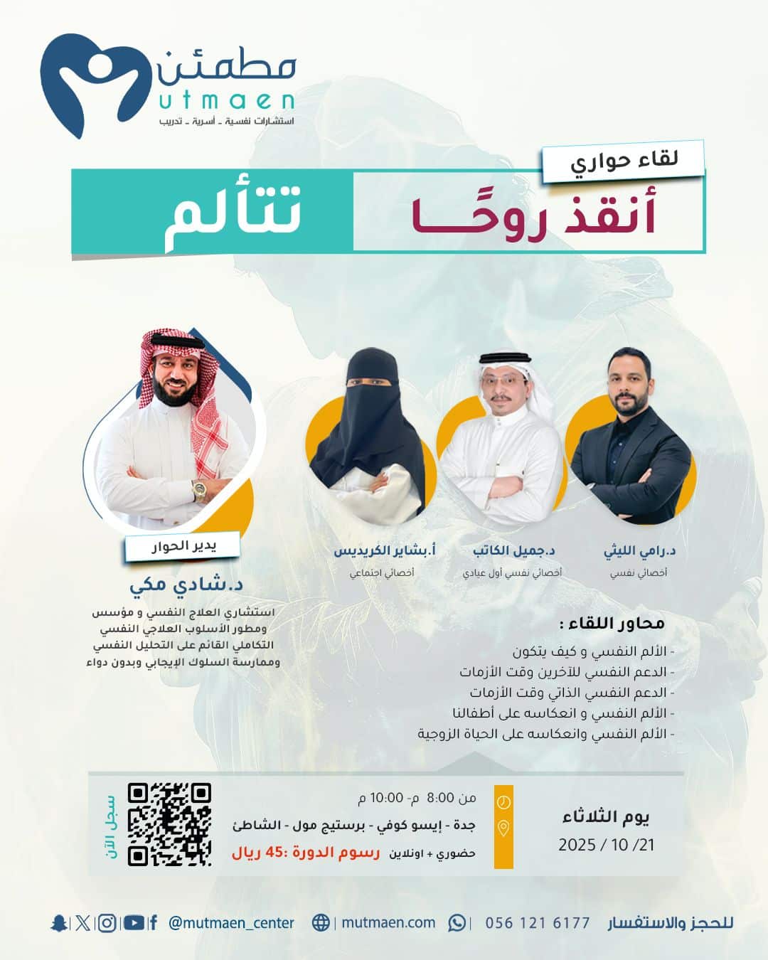 ينظم مركز مطمئن للاستشارات النفسية والأسرية لقاءً حواريًا بعنوان: